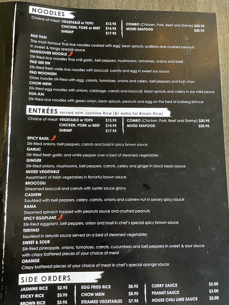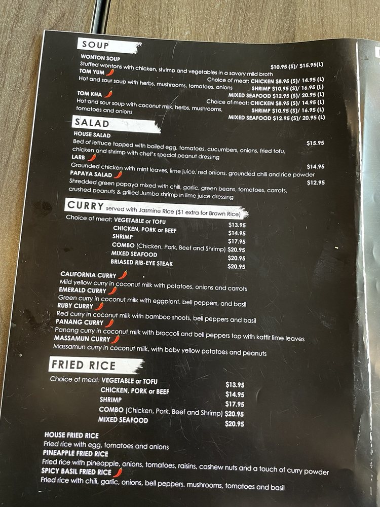 Start your meal with delightful starters like Beef Jerky and Coconut Shrimp, or savor the rich tastes of their renowned soups, including Tom Kha and Wonton Soup. Known for quality and generous portions, patrons rave about the hangover noodles and Pad Thai. With vegan options available, everyone in your party will find something to love.